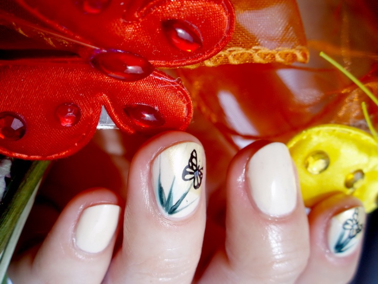 Podklad bílo žlutý lak vlastní výroby (chápejte smícháním barev), táva nakreslena ručně amotýlek je razítko z Essence destičky