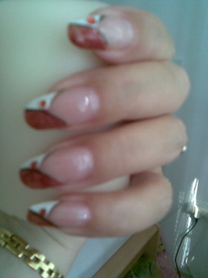 červenobíločerné s kamínkem. Jsou mé přírodní, pouze zdobené profi manikérkou.Ale vydržely krátce. Na gelových vydrží mnohem déle. Tady vidím jedinou výhodu gelovek.