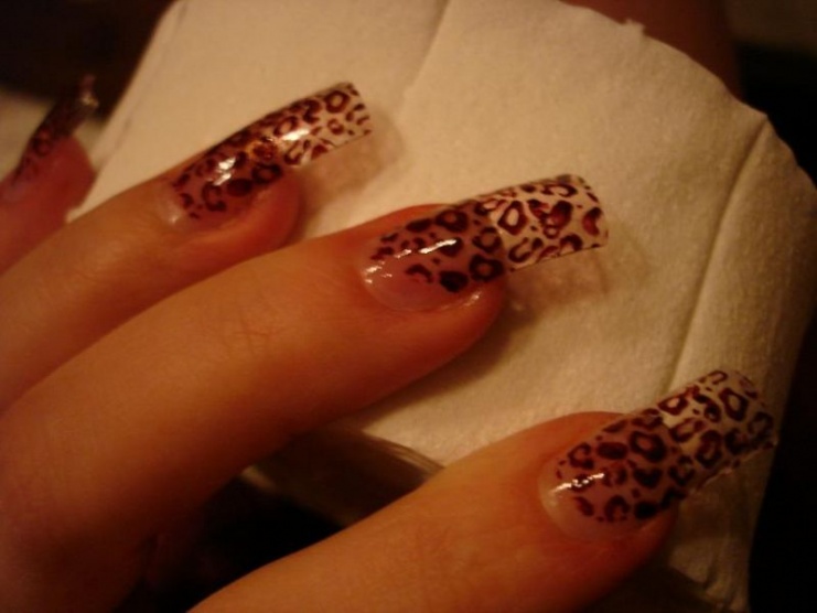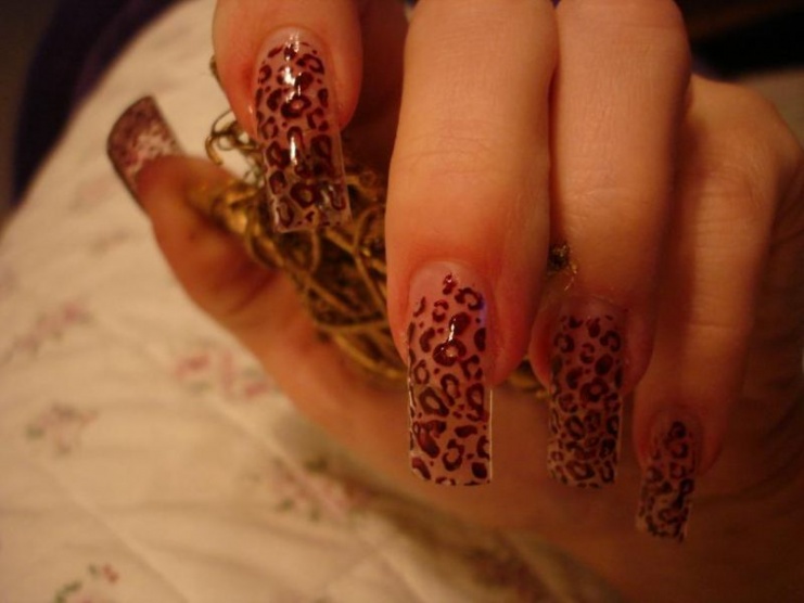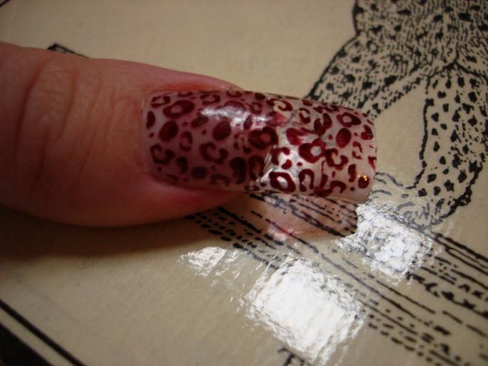 Mám i leopardí typy, ale protože bych je potom takové musela mít pořád, tak teď průhledné typy s čirým gelem, razítka Konad a purpurový lak Konad.