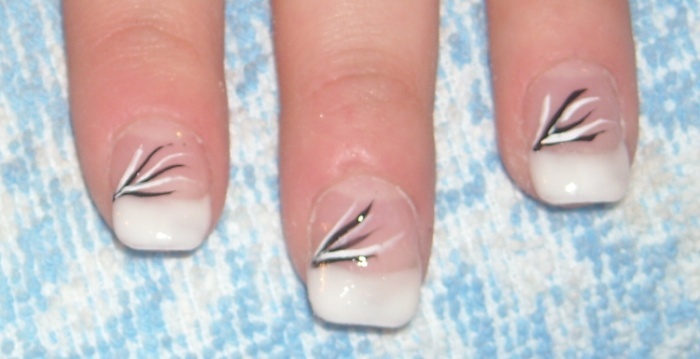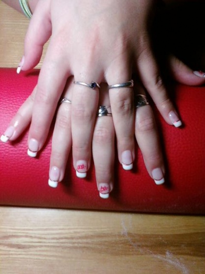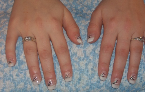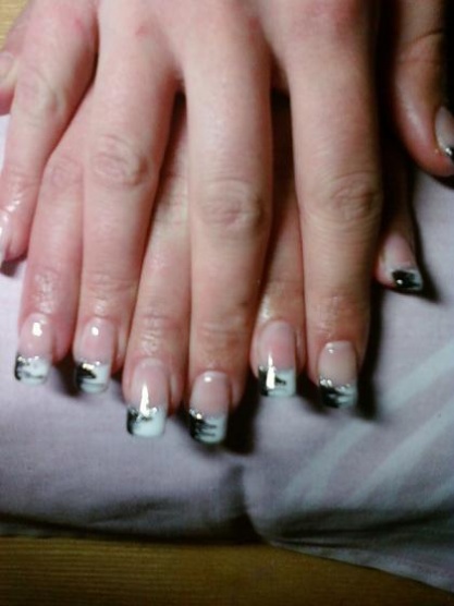 Oboje jsou dělané akrygelem chtěla jsem ho vyzkoušet a dělalo se mi s ním moc dobře.....jinak používám Enii gely....ta francie je dělaná bílým a černým gelem,natřela jsem půlku tak a půlku tak a pomerančovým dřívkem to jakoby do stran rozmatlala,dala do lampy a pak třpytivým lakem linky pod francii a navrh vrstvu gelu a pak jen dopilovat hrany...olejíček a vrchní lak s leskem...a bylo...byly to nové nehty tak práce byla 2hodiny