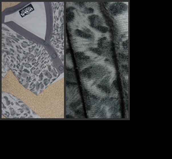 Vzor gepard , příjemný materiál , celkem elastický , Barva šedá ( světlá tmavá ) . Dlouhý rukáv . Kabátek je na 3 šedé knoflíčky . Výstřih do V , dělá pěkný dekolt , o rozměry si pište značka z Anglie Wall Moje cena je 149 kč