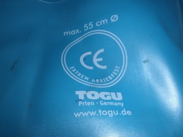 Velmi kvalitní, málo použitý míč TOGU, průměr 55 cm, max. zatížení až 500 kg. Barva je tmavě tyrkysová - lehce perleťová, občas malý flíček. Fotila jsem ho už vyfouknutý.