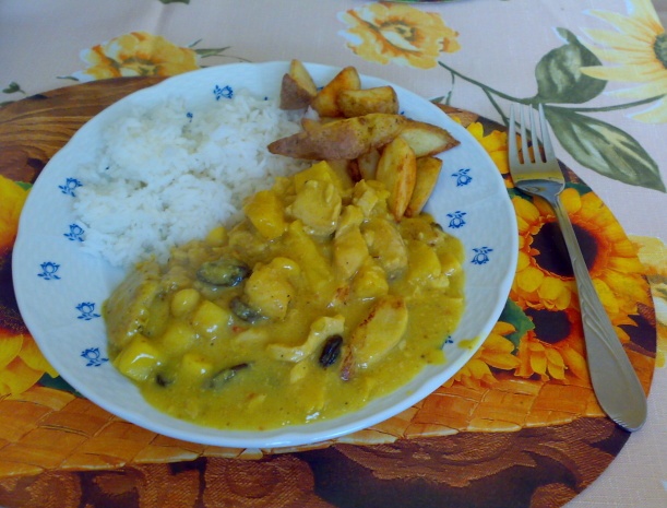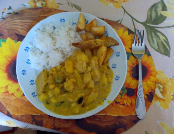 Orestujeme kuřecí prsa, a zprudka zarestujeme ananas pokrájený na kostičky a přidáme jablko nakrájené na malé kostičky. Zlehka posypeme kari kořením. Rozpustíme nastrouhanou nivu se smetanou, přidáme rozinky a mandle rozkrojené napůl. Dochutíme světlou sojovou omáčkou a v případě potřeby zahustíme jíškou.