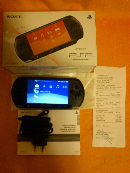 Nabízím konzoli Sony PSP 1004 v originální krabici s účtenkou. Nevhodný vánoční dárek. Pouze odzkoušena. Koupeno 9.12.2011 (účtenka viz foto) - tudíž 2 roky záruka. Plus obal na PSP (nový v záruce s účtenkou), paměťová karta Memory stick Pro Duo 4GB (nová v záruce s účtenkou), hry: Loco Roco (bazarová), Ratchet&Clank (bazarová), Medievil (nová v záruce s účtenkou). S osobním převzetím nesouhlasím, na dobírku nezasílám, děkuji za pochopení.