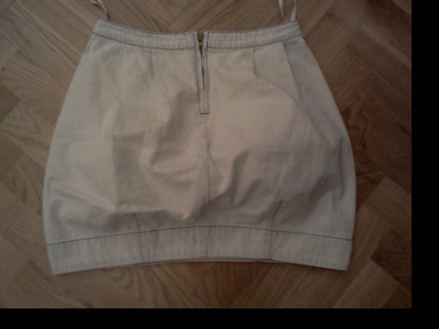 Hezká nová světlounká minisukně. Mírně do balonového střihu. Štepovaná zrzavou nití. Vzadu zip a po stranách kapsy. Cena 150Kč včetně poštovného
