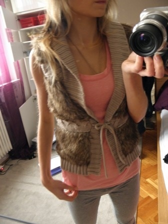 Prodám za 380kč párkrát nošenou vestičku zn. FF z Tesca.. Je snad dvakrát vzatá.. Je to hnědá pletenina s chlupatým kožíškem..
