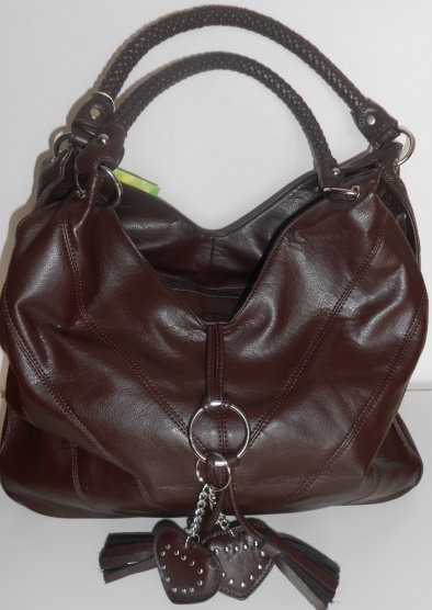 Prodám hnědou kabelu-imitace kůže s krásnými pokovanými přívěsky ve tvaru srdce.Kabelka má 33cm na výšku 44cm na šířku-je velmi prostorná.Úplně nová zapomenutá ve skříni