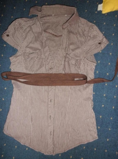 Moc hezká košile nošená občasně,sedí na XS i S.Je k ní páseček z hnědé látky zlatý je ilustrativní,Moc pěkně a hezky sedí.zn.Tally WEIJL.