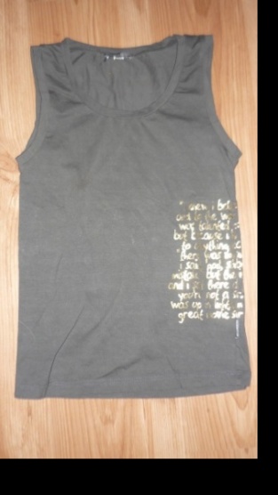 Tílko na tlusté ramínka . Barva hnědozelená se zlatým nápisem na boku . Je elastické ale mě bohužel malé .