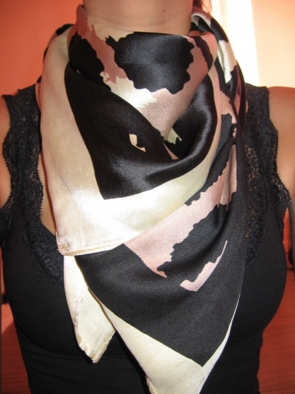 Šátek je ve tvaru velkého čtverce, rozměry bych pak případně dodala, nemám u sebe metr.