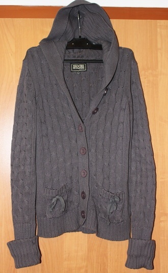 Velikos psána L,ale může být i M. Pěkný svetr na knoflíčky na kapsách jsou mašle.Původní cena cca 500 Kč.