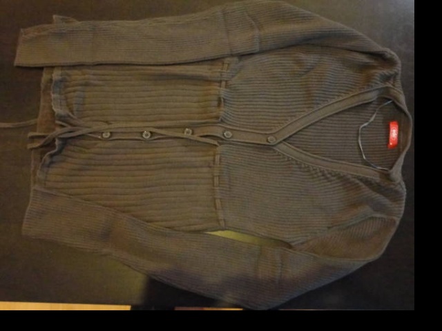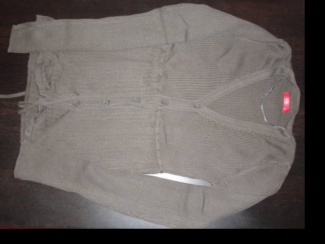Hnědý svetr na knoflíky se šňůrkou pod prsy EDC by Esprit. Délka je 60 cm, šířka se špatně určí, protože se jedná o materiál, který se po vyprání hodně smrskne, ale jinak je dost natahovací. Ale odpovídá klasickému M.