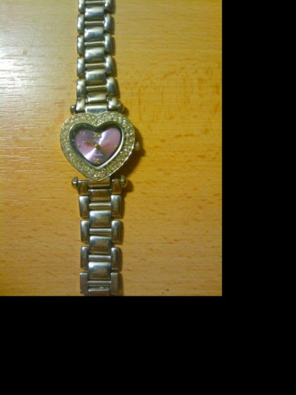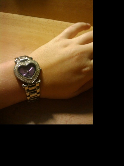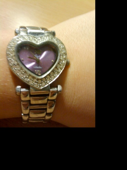 Krásné nošené hodinky ve tvaru srdíčka ..jsou na nich kamínky a prostředek je do fialova