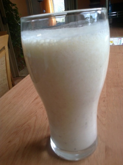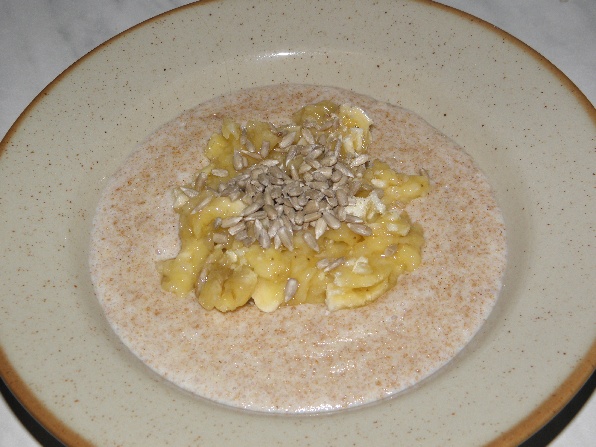 Sn: 10g bebe, 20 g dobrá vláknina, 20 g banán, 150 g bílý jogurt, skořice, půl hrnku kafe s mlíkem