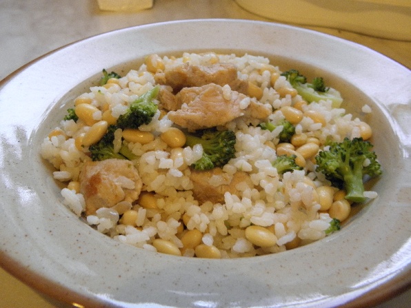 O: rýže se sójovými boby a brokolicí, vepřové maso, sýr, kys. okurky