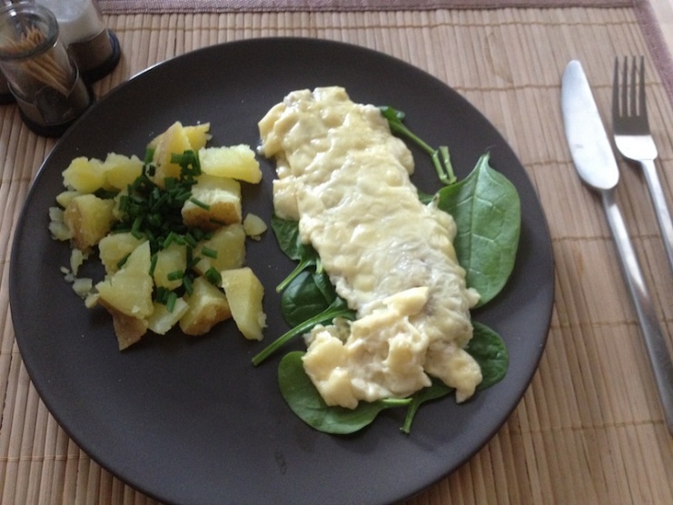 Cituji chocolattecoffee: Rybí filé zapečené se sýrem, špenátové čerstvé listy a jeden brambor s pažitkou