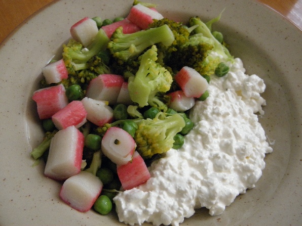 V: brokolice, hrášek krabí tyčinky, cottage (100g)