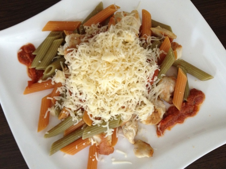 Oběd: Zeleninové těstoviny s krůtím masem, bolognese omáčkou a strouhaným sýrem