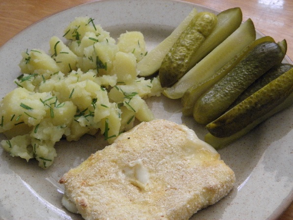 O: obalovaný sýr pečený v troubě, brambory s pažitkou, kys. okurky