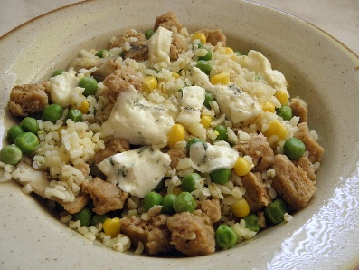 O: bulgur se sójovým masem, žampiony, hrášek, kukuřice, niva