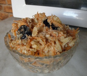 SN: mrkvovo-ovocný salát (mrkev, půl banánu, jablko, sušené švestky, ořechy, lžíce jogurtu, lžíce otrub, kokos)