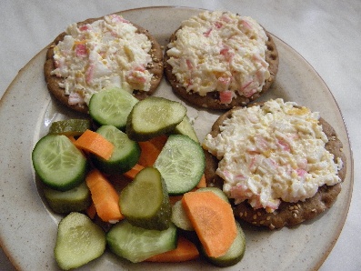 V: 3 knackebroty s vajíčkovo-krabí pomazánkou, zelenina
