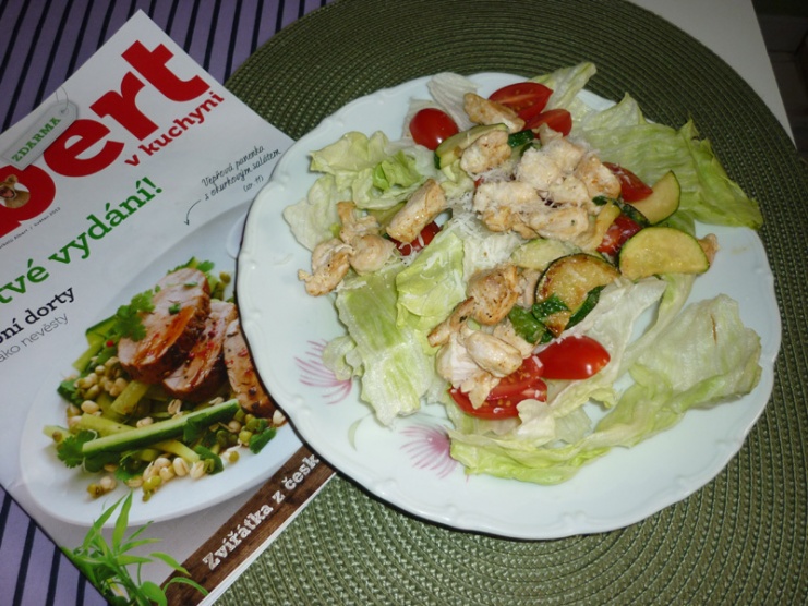 18:00 ledový salát, cherry rajčata, 100g kuř.masa, bazalka, cuketa, parmazán