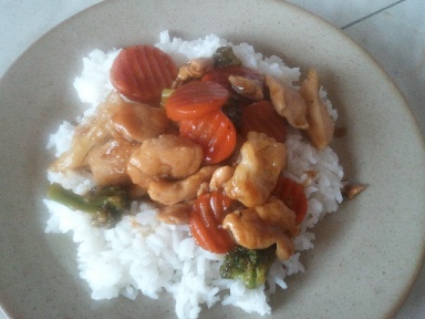 O: kuřecí čína (kuřecí prsa, zelenina, sladkokyselá omáčka), rýže