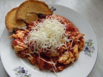 V: 2 míchaná vajíčka s rajčaty a sýrem, 1 bonavita toast