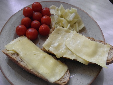 V: rozpečená špaldová bageta s trochou másla, sýr, zelenina
