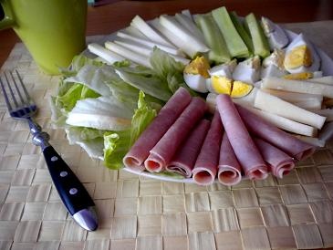 -kuřecí šunka, sýr, vajíčka na tvrdo, ledový salát, kedlubna a salátová okurka