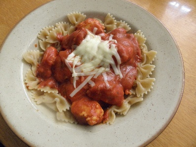 O: celozrnné těstoviny s rajčatovou omáčkou a kuličkami z mletého kuřecího masa, posypané sýrem