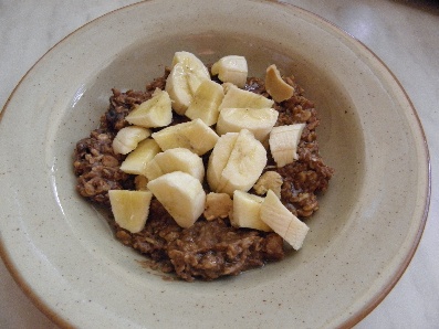 SN: ovesná kaše s hořkou čokoládou, arašídové máslo, banán, agáve sirup