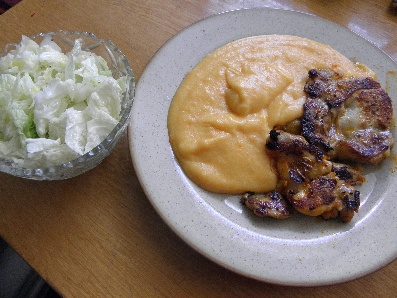 O: kuřecí stehenní plátek, bramborovo-mrkvové pyré, čísnké zelí