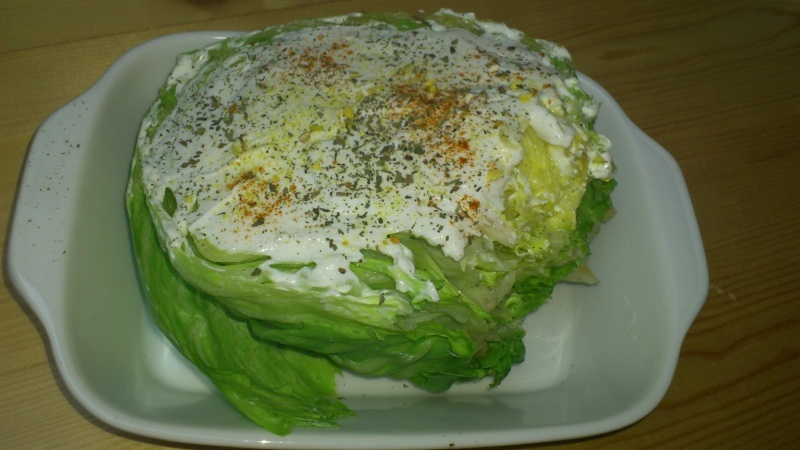 ledový salát rozkrojit, opatrně vykrojit stvol, prokořenit slaným kořením, potřít jogurtem, okořenit a ovonět zeleným kořením,