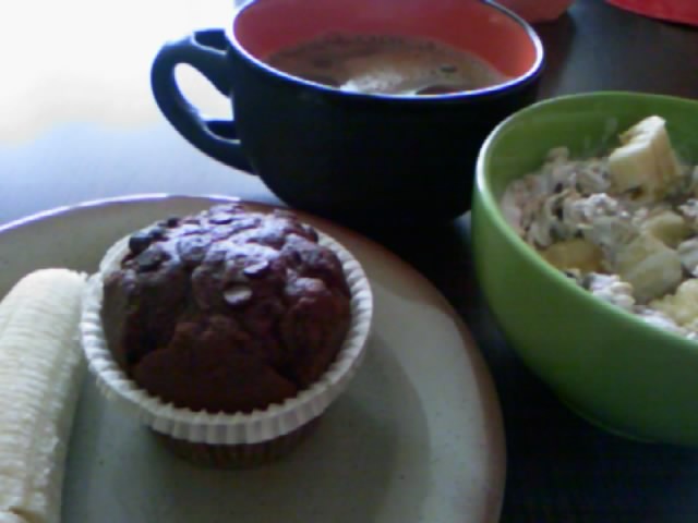 sn: domácí müsli s banánem a jogurtem, čokoládový muffin