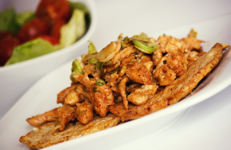 No a večer bude malá tortila s kopou zeleniny a orestovaným kuřátkem s jogurtovou zálivkou.