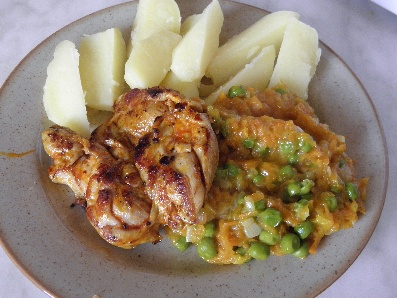 O: dušená mrkev s hráškem, kuřecí stehenní plátek, brambory