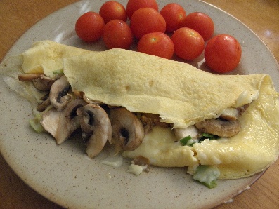 V: vaječná omeleta se sýrem a žampiony, rjčata, švestková Jogobella