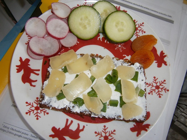 SV:plátek žitného chleba s ricotou,kolečkem tvarůžků + ředkvička,trochu okurky a 2 sušené meruňky (neslazené)