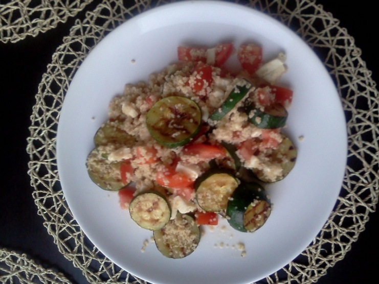 19,30 kuskus 40g s cuketou 300g a rajčetem a 60g mozzarely
