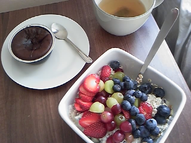 sn: sypané müsli s hrstí granoly, jahody, borůvky a hrozny se sójovým jogurtem + belgické čokoládové soufflé