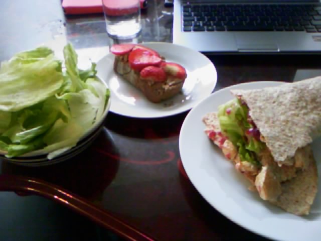 ve: kuřecí nudličky ve philadelpii light s brusinkami v celozrnné tortille, zeleninový salát s hroznovým vínem a plátek ořechového chleba s burákovým máslem a jahodou jako dezert