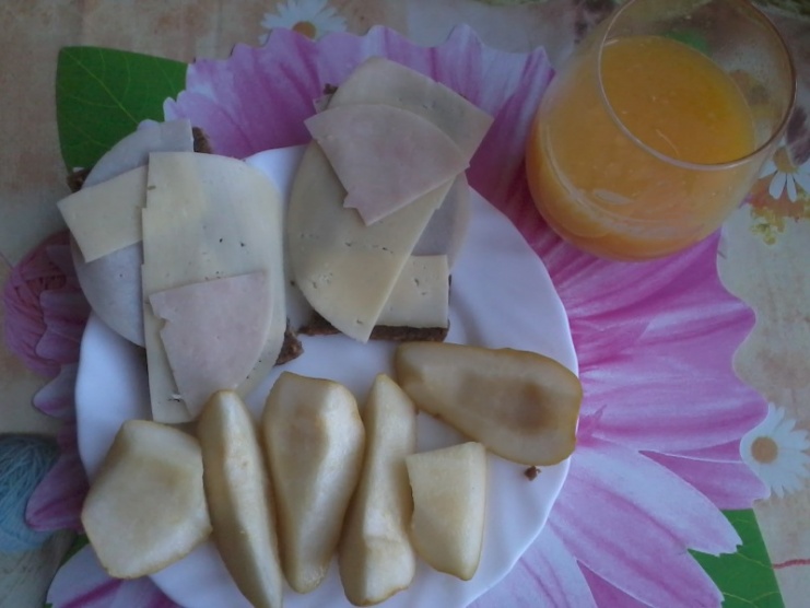 Sn: krajíc chleba 1/2 s máslem a s marmeládou, druhá polovina s pažitkovým pom. máslem