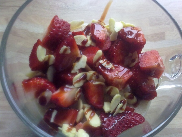 Svačina: krupicová pohanková kaše z polotučného mléka, jahody, mandlové plátky,dat. sirup