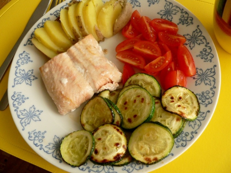 Ob: losos připravený v alobalu bez tuku, brambory ve slupce, orestovaná cuketa, cherry rajčátka