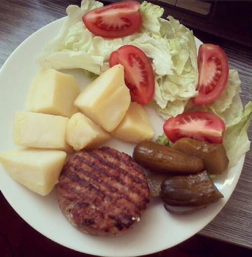 OB: vepřový libový burger dělaný bez tuku na pánvi+brambory+zelenina