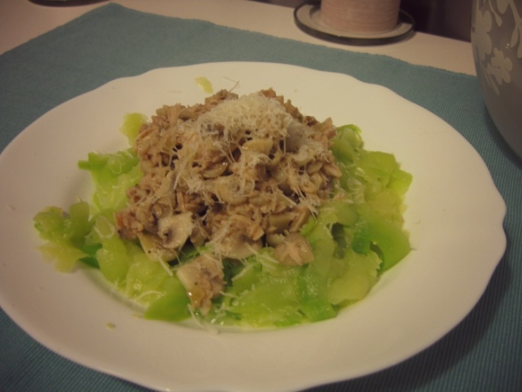 Dala jsem na něj žampiony s tuňákem a posypala parmezánem. Kaloricky je to zase někde jinde. Porce je možná větší, ale nesvačila jsem kvůli škole.