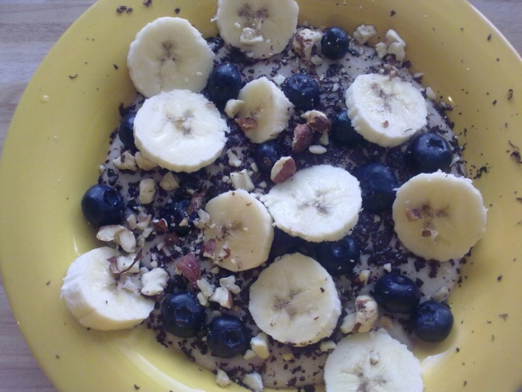 snídaně: celozrnná špaldová kaše, borůvky, banán, 81% čokoláda, drcené lískáče