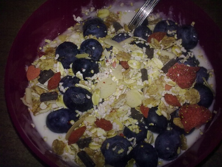svačina: bílý selský jogurt 200g, borůvky 60g, elixír z lásky 10g (müsli z mixit)
